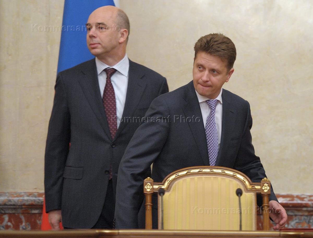 Первый заместитель министра промышленности, науки и технологии России Андрей Свинаренко (слева) и заместитель министра экономического развития и торговли России Михаил Дмитриев (справа) на заседании Московского технологического форума. Форум состоялся в здании Московского технологического института.
