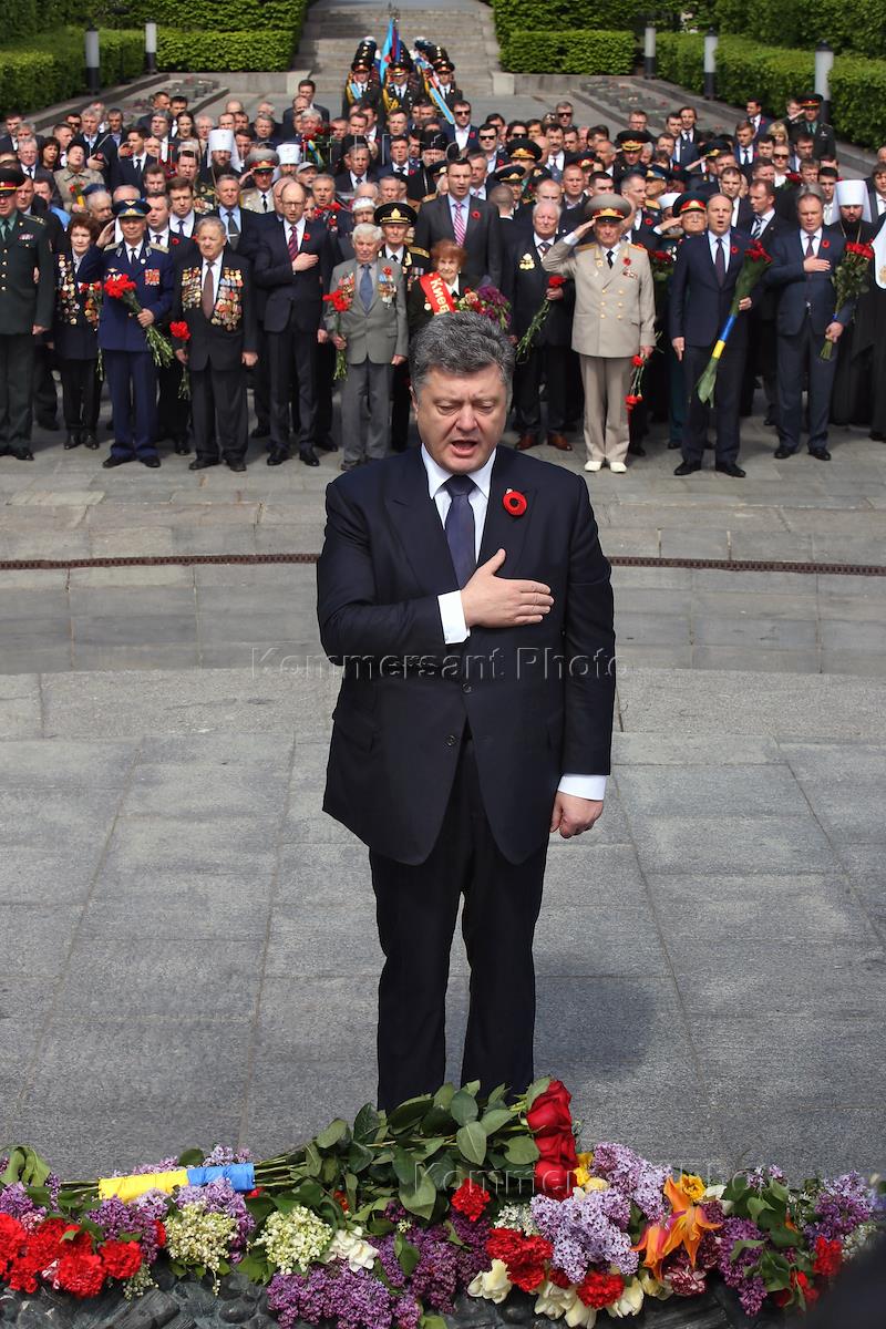 Президент Украины Петр Порошенко во время возложения цветов к Вечному огню на праздновании Дня Победы 9 мая в Киеве.