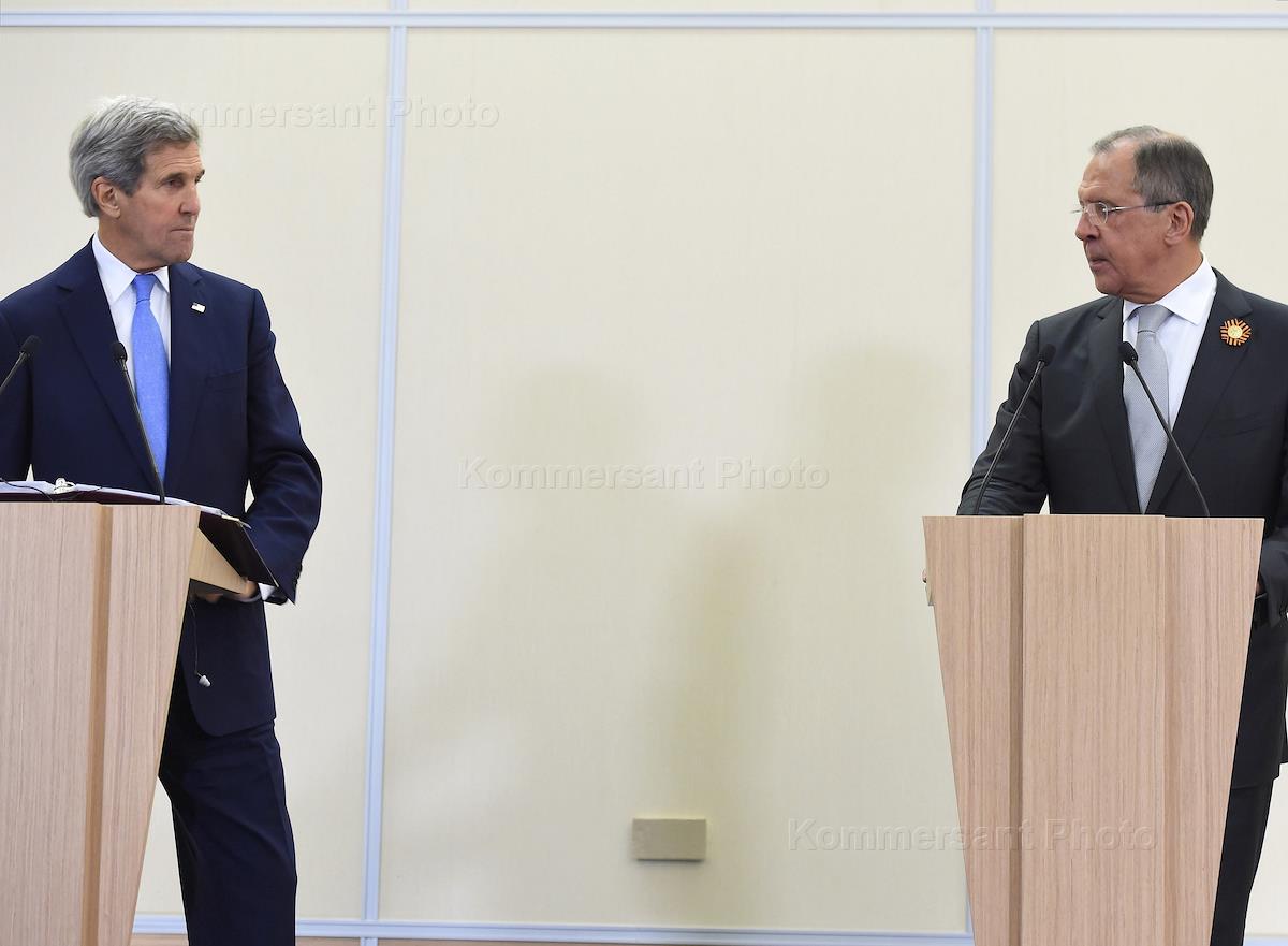 Министр иностранных дел России Сергей Лавров (слева) и государственный секретарь Соединённых Штатов Америки Джон Керри (справа) перед началом встречи с президентом России Владимиром Путиным в резиденции "Бочаров ручей" в Сочи.