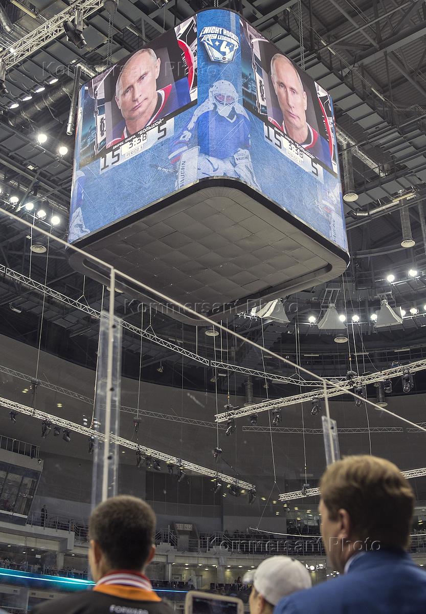Фотография президента России Владимира Путина (вверху) на гала-матче турнира Ночной хоккейной лиги в Сочи.