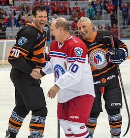 Гала-матч турнира Ночной хоккейной лиги прошел в Сочи. Член правления Ночной Хоккейной Лиги Алексей Касатонов (слева), бывший член сборной по хоккею СССР Валерий Каменский (слева внизу), министр обороны России Сергей Шойгу (второй слева), президент России Владимир Путин (в центре), председатель Комиссии Совета Федерации по физической культуре, спорту и развитию олимпийского движения Вячеслав Фетисов (третий справа), хоккеист Павел Буре (справа), президент Ночной хоккейной лиги (НХЛ) Александр Якушев (второй справа внизу) после гала-матча.