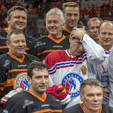 Председатель совета директоров КХЛ, президент СКА Геннадий Тимченко (третий слева) и президент России Владимир Путин (в центре) после гала-матча турнира Ночной хоккейной лиги в Сочи.