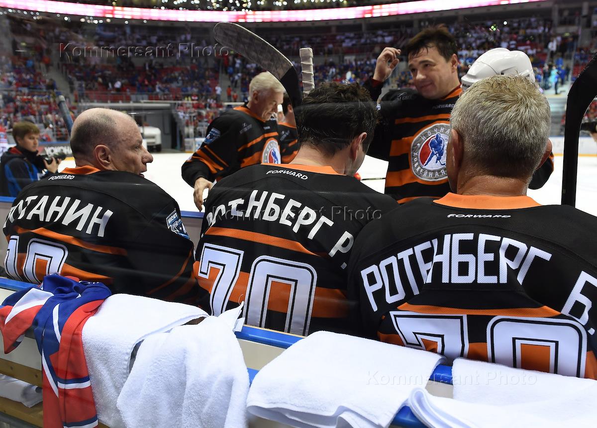 Гала-матч турнира Ночной хоккейной лиги в Сочи. Слева направо: президент "Холдинговой компании "Интеррос" Владимир Потанин, вице-президент по маркетингу и развитию бизнеса хоккейного клуба СКА Роман Ротенберг губернатор Московской области Андрей Воробьев и президент ХК "Динамо" (Москва), член Совета директоров КХЛ Аркадий Ротенберг во время матча.