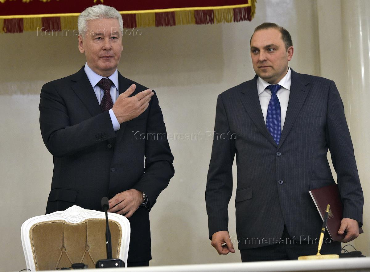 Начальник Московского метрополитена Дмитрий Пегов (слева) и мэр Москвы Сергей Собянин (справа) на церемонии подписания соглашения о сотрудничестве между метрополитенами Москвы и Пекина.