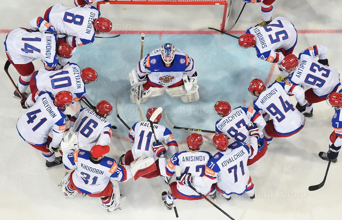 Чемпионат мира по хоккею. Финальный матч за 1-ое место. Сборная команда России перед началом игры на матче между сборными командами России и Канады. Матч прошел на стадионе "О2 Арена".