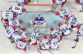 Чемпионат мира по хоккею. Финальный матч за 1-ое место. Игроки сборной команды России во время матча между сборными командами России и Канады. Матч прошел на стадионе "О2 Арена".