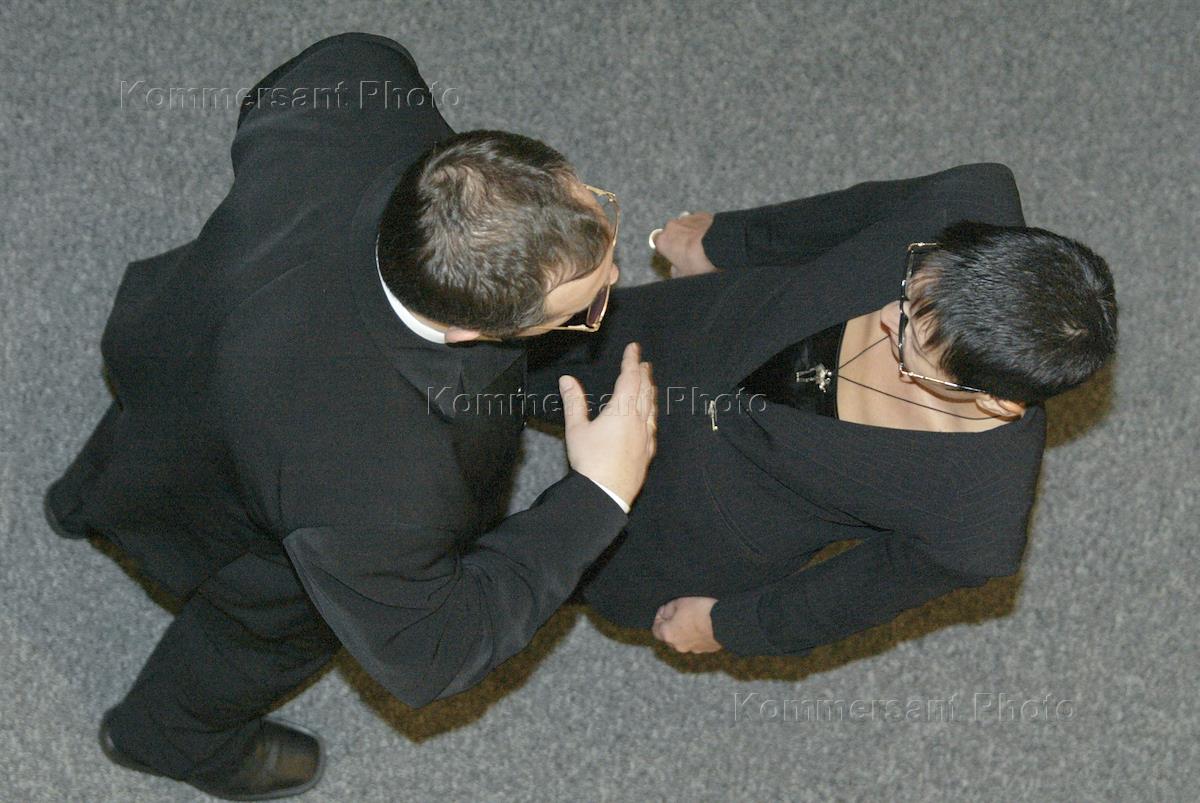 Members of the State Duma 'Union of the Right Forces' (SPS) faction Boris Nadezhdin (left) and Irina Khakamada (right) chat away in the lobby of the legislature.