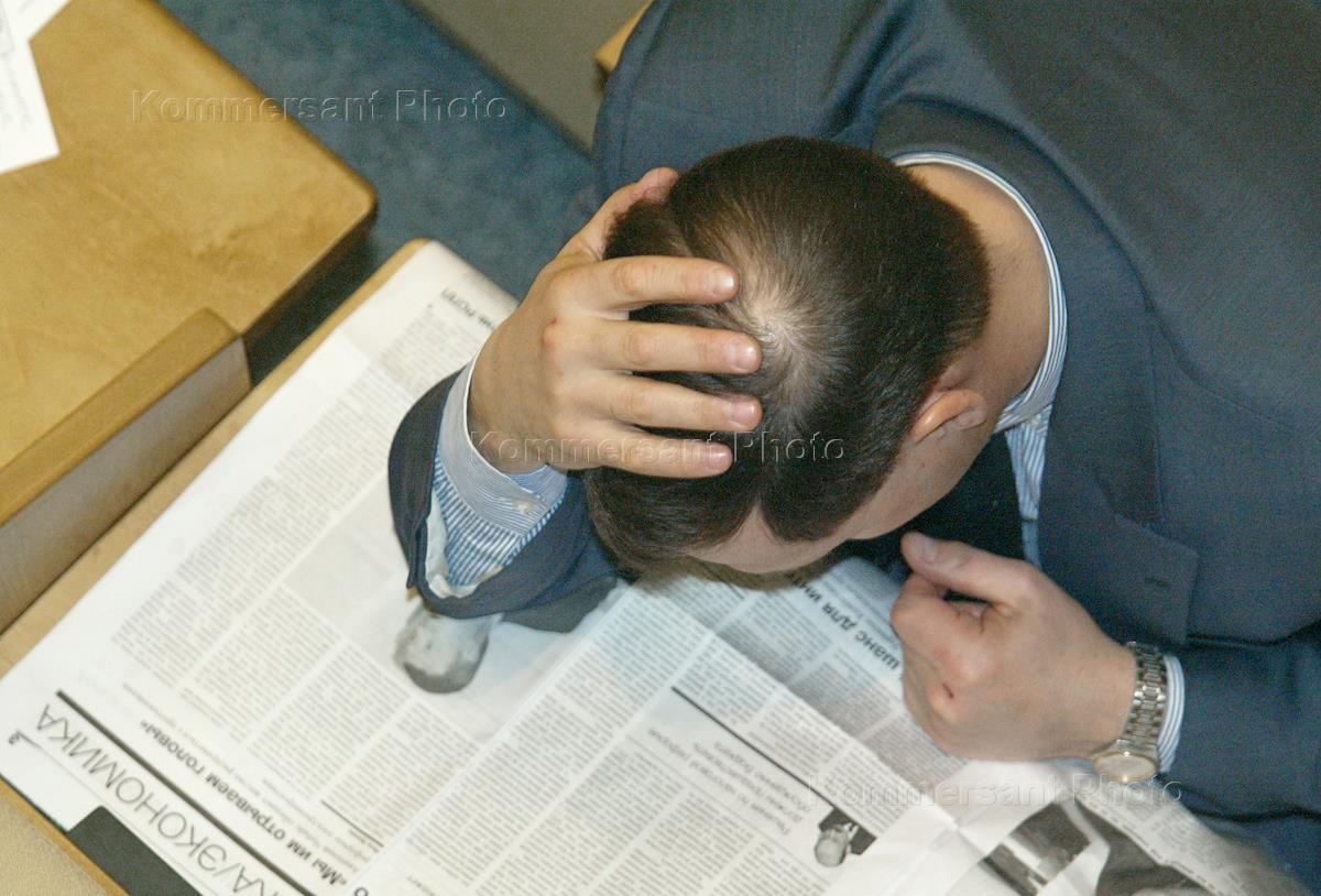An unidentified member of the State Duma pores over an issue of the Kommersant business daily during a session of the legislature.
