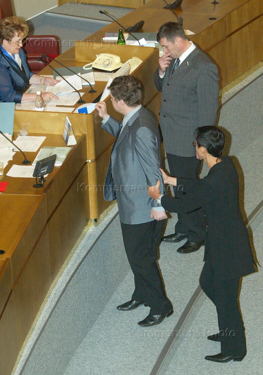 First vice speaker of the State Duma Lyubov Sliska (left) listens to the member of the 'Yabloko' ('Apple') faction Sergey Mitrokhin (second from the left), tugged at the sleeve by another prominent member of the faction Irina Khakamada (right) during a session of the legislature.