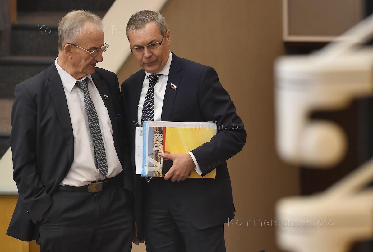 Член комитета Государственной думы (ГД) Рссии по жилищной политике и жилищно-коммунальному хозяйству Юрий Селиванов (слева) и заместитель председателя комитета ГД по делам общественных объединений и религиозных организаций Александр Тарнавский (справа) во время заседания Госдумы.