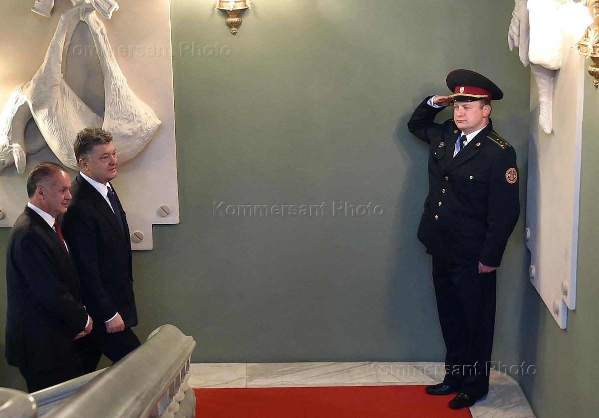 Президент Словакии Андрей Киска (слева) и президент Украины Петр Порошенко (в центре) во время встречи.