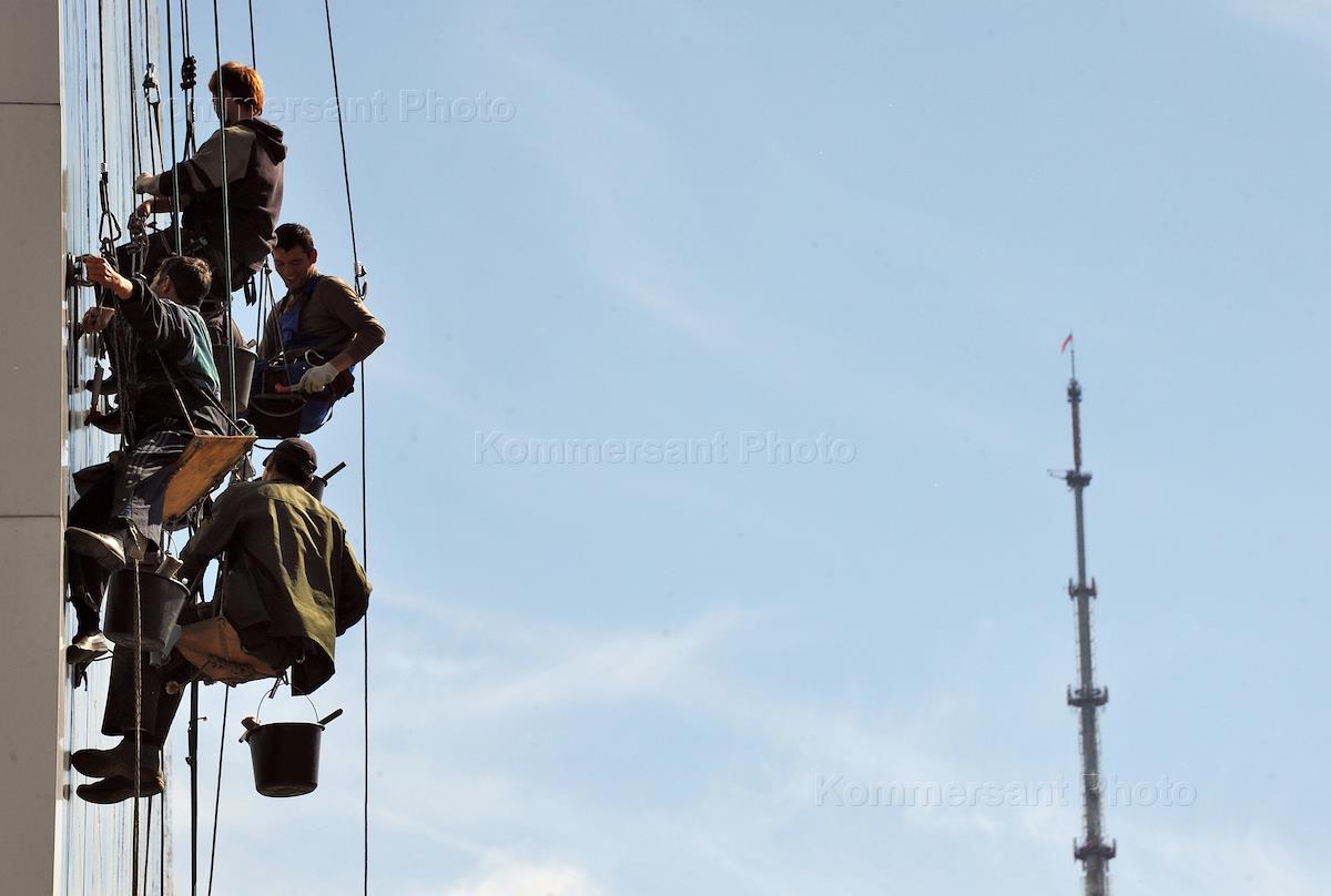Работа Всероссийской выставки достижений народного хозяйства (ВДНХ). Высотные работы по мытью фасада здания Океанариума.