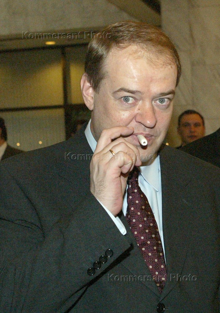 Moscow Mayor Yury Luzhkov (left) attends the briefing headlined 'Securing Investors' Rights: Issues and Mechanisms'. The briefing was held in the President Hotel.