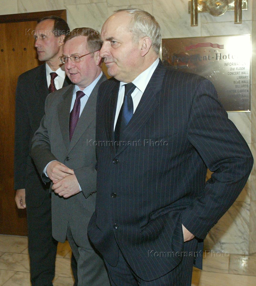 Chairman of the Russian Accounting Chamber (state audit authority) Sergey Stepashin (centre) and head of the State Building and Construction Committee (Gosstroy) Nikolay Koshman (right) take part in the briefing headlined 'Securing Ivestors Rights - Issues and Mechanisms'. The briefing was held in the President Hotel.