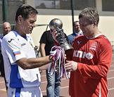 Турнир по футболу между командами фракций Госдураственной думы (ГД) России прошел в Олимпийском кмплексе "Лужники". Заместитель председателя комитета ГД по делам общественных объединений и религиозных организаций Марат Сафин (справа) во время матча между командами фракций партии "Единая Россия" и Коммунистической партией России (КПРФ).