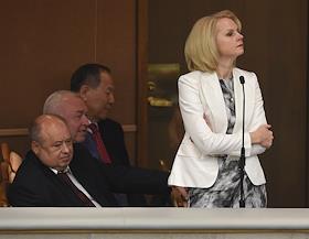 Председатель комитета Государственной думы России по вопросам семьи, женщин и детей Елена Мизулина (слева) и председатель Государственной думы России Сергей Нарышкин (справа) на пленарном заседании Госдумы России.