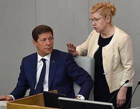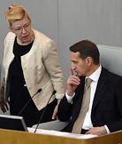 Первый заместитель председателя Государственной думы (ГД) России Александр Жуков (слева) и председатель комитета ГД России по вопросам семьи, женщин и детей Елена Мизулин (справа) во время пленарного думского заседания.