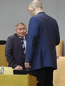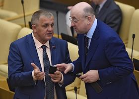 Заместитель председателя комитета Государственной думы (ГД) России по труду, социальной политике и делам ветеранов Николай Коломейцев (слева) и председатель комитета ГД России по конституционному законодательству и государственному строительству Владимир Плигин (справа) во время пленарного думского заседания.