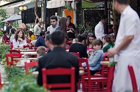 Виды Тбилиси. Посетители на летней веранде ресторана.