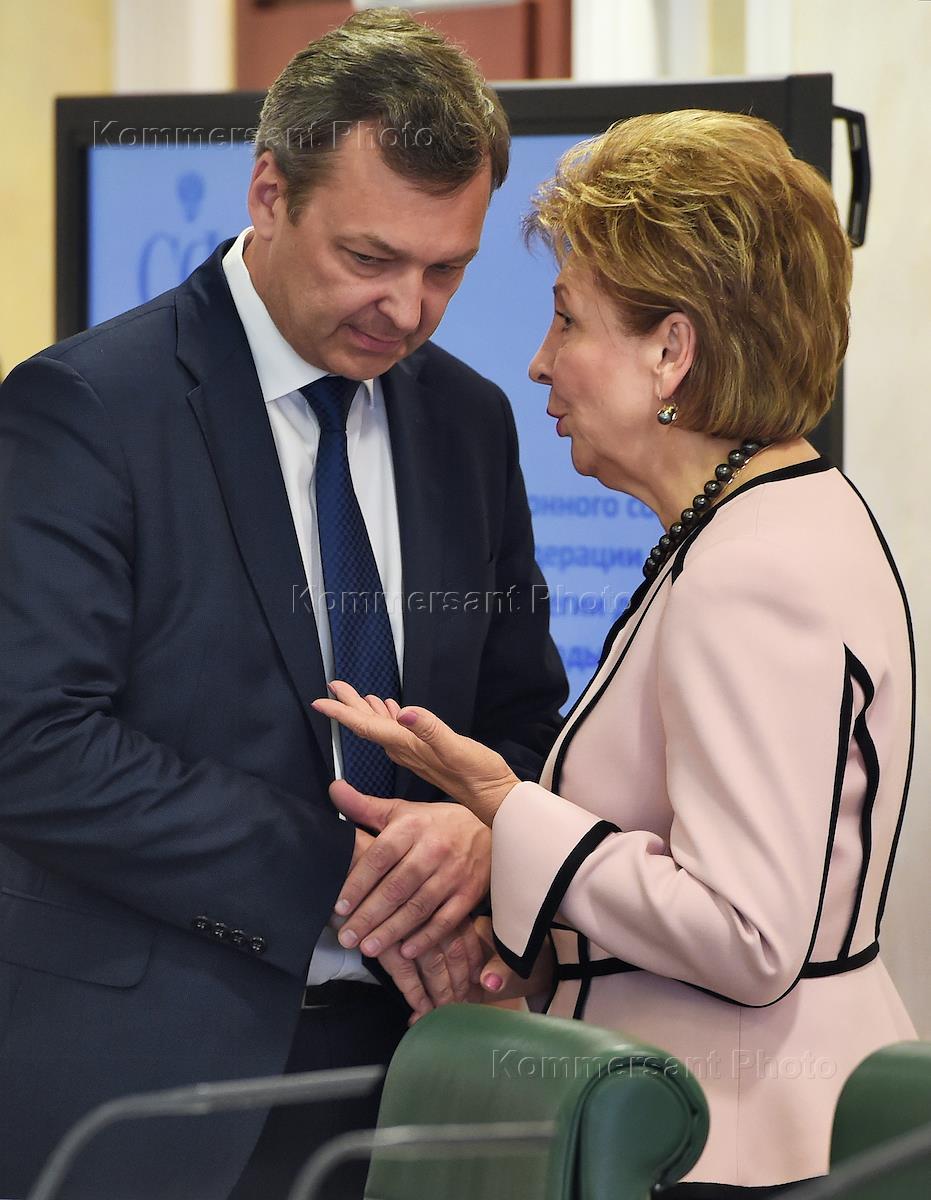 Полномочный представитель правительства России в Совете Федерации России Андрей Яцкин (слева) и представитель в Совете Федерации России от исполнительного органа государственной власти Воронежской области Галина Карелова (справа) перед началом заседания Координационного совета при президенте России по реализации Национальной стратегии действий в интересах детей на 2012-2017 годы.