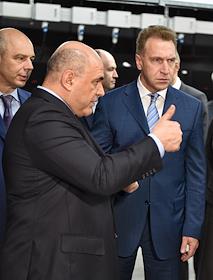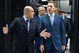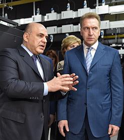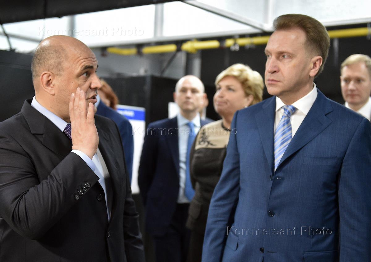 Руководитель Федеральной налоговой службы России Михаил Мишустин (слева) и первый заместитель председателя правительства России Игорь Шувалов (справа) во время церемонии открытия Федерального центра обработки данных Федеральной налоговой службы (ФЦОДа ФНС) России в Дубне.