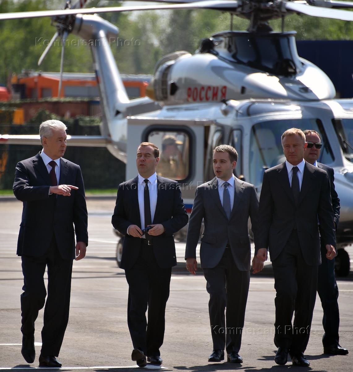 Мэр Москвы Сергей Собянин (слева) и председатель правительства России Дмитрий Медведев (в центре) во время церемонии открытия Технопарка в сфере высоких технологий в Московском физико-техническом институте (МФТИ).