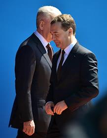 Председатель правительства России Дмитрий Медведев (слева) и мэр Москвы Сергей Собянин (справа) во время церемонии открытия Технопарка в сфере высоких технологий в Московском физико-техническом институте (МФТИ).