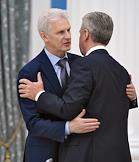 Председатель совета директоров АФК "Система" Владимир Евтушенков (слева) перед началом заседания попечительского совета Московского государственного университета имени М.В.Ломоносова под председательством президента России Владимира Путина.