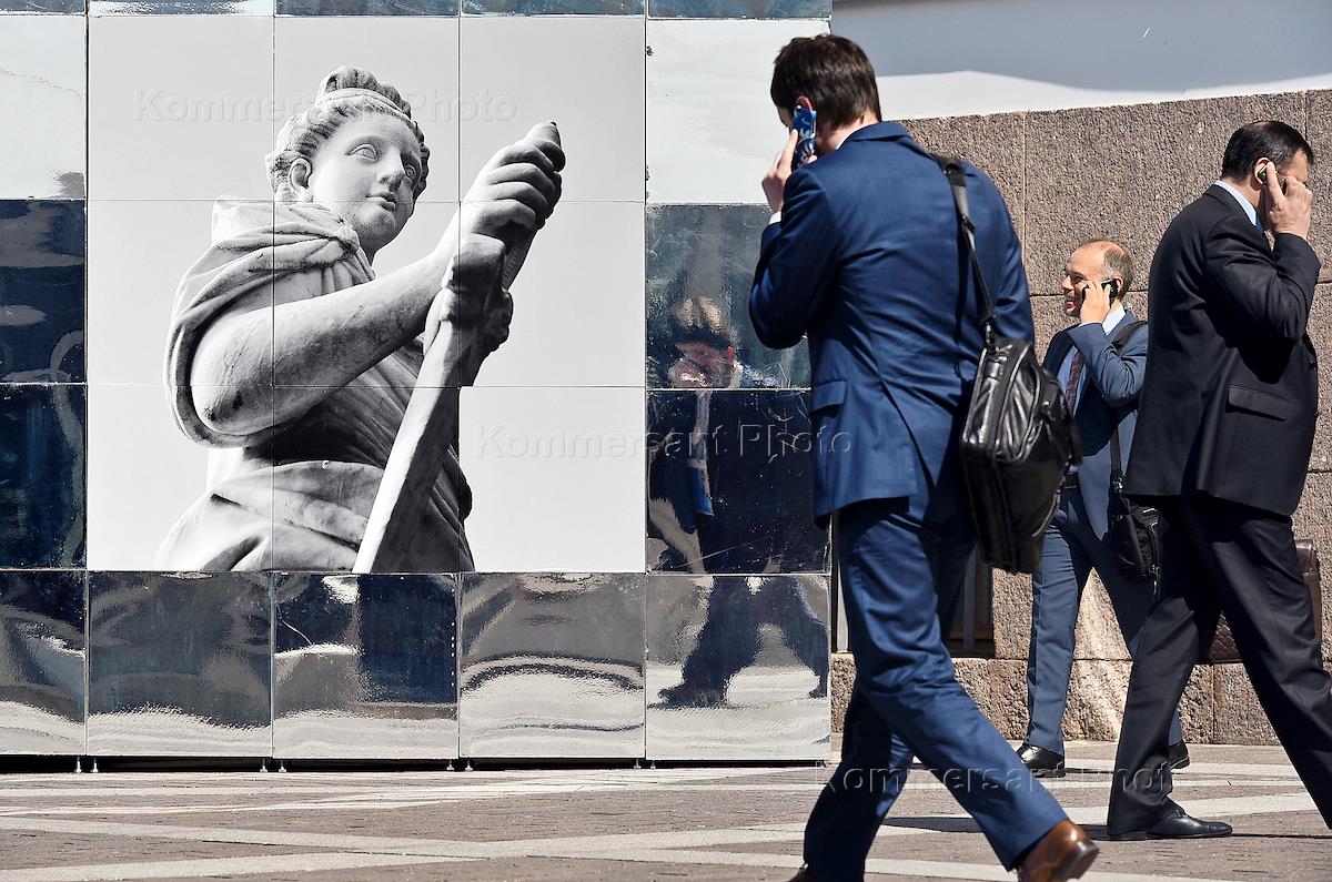 V Saint Petersburg International Legal Forum. Genre photo. Forum participants talking on the phone with a picture of Themis in the background.