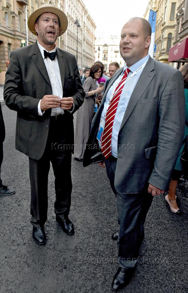 V Петербургский Международный Юридический Форум. Вечеринка "ФОРС–МАЖОР" "Legal Drink" издательского дома "Коммерсантъ" прошла в ресторане "Сардина" на улице Рубинштейна. Министр юстиции России Александр Коновалов (слева) и статс-секретарь - заместитель министра юстиции России Юрий Любимов (справа) во время вечеринки.
