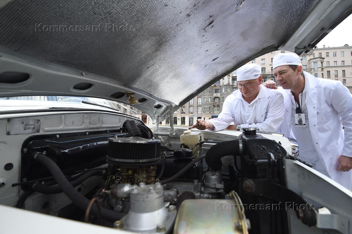 Ралли старинных автомобилей L.U.C Сhopard Classic Weekend Rally, проходящее при поддержке компании Chopard. Справа налево: актер, продюсер Игорь Угольников, музыкант Евгений Моргулис и певец Валерий Сюткин во время старта ралли.