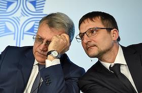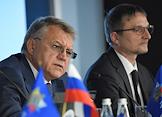 Генеральный директор ОАО "Концерн ПВО "Алмаз – Антей" Ян Новиков (слева) и советник генерального конструктора концерна "Алмаз-Антей" Михаил Малышевский (справа) во время презентации концерна "Алмаз-Антей", посвященной результатам собственного расследования катастрофы малайзийского самолета Boeing 777, сбитого 17 июля 2014 года над Украиной.