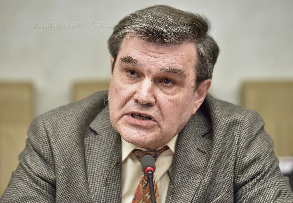 Заседание "Круглого стола" на тему "Об итогах обзорной конференции по Договору о нераспространении ядерного оружия в контексте национальных интересов Российской Федерации". Заместитель руководителя Центра евроатлантических и оборонных исследований Российского института стратегических исследований Владимир Новиков во время заседания в Совете Федерации России.
