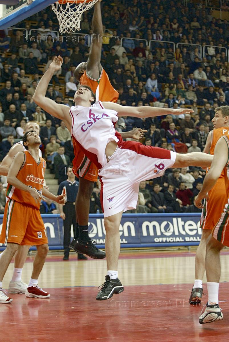 Второй матч в турнирных рамках TOP 16 баскетбольной Евролиги между баскетбольными командами "ЦСКА"(Россия) и "Улкер" (Турция). Игровой момент встречи.