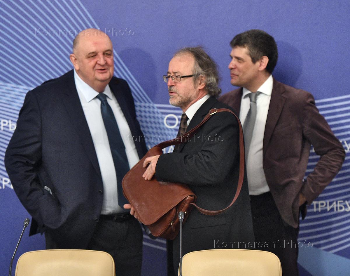 Заседание Открытой трибуны на тему: "Русский язык в современном мире". Слева направо: советник председателя Государственной думы (ГД) России Павел Хорошилов, директор Института русской литературы Российской академии наук, директор Пушкинского дома Всеволод Багно и директор Государственного литературного музея (ГЛМ) Дмитрий Бак перед началом заседания в ГД России.