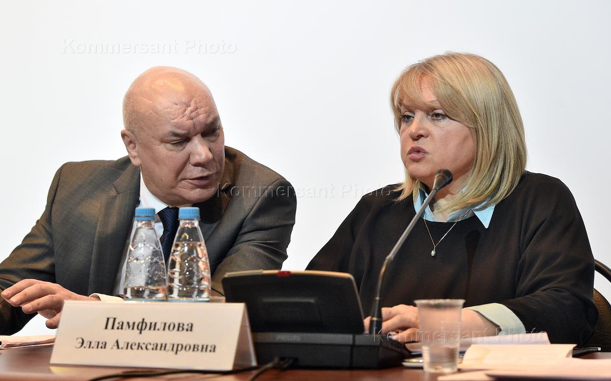 Заместитель председателя Верховного суда России Владимир Давыдов (слева) и уполномоченный по правам человека в России Элла Памфилова (справа) во время заседания Координационного совета российских уполномоченных в Доме русского зарубежья имени Александра Солженицына.