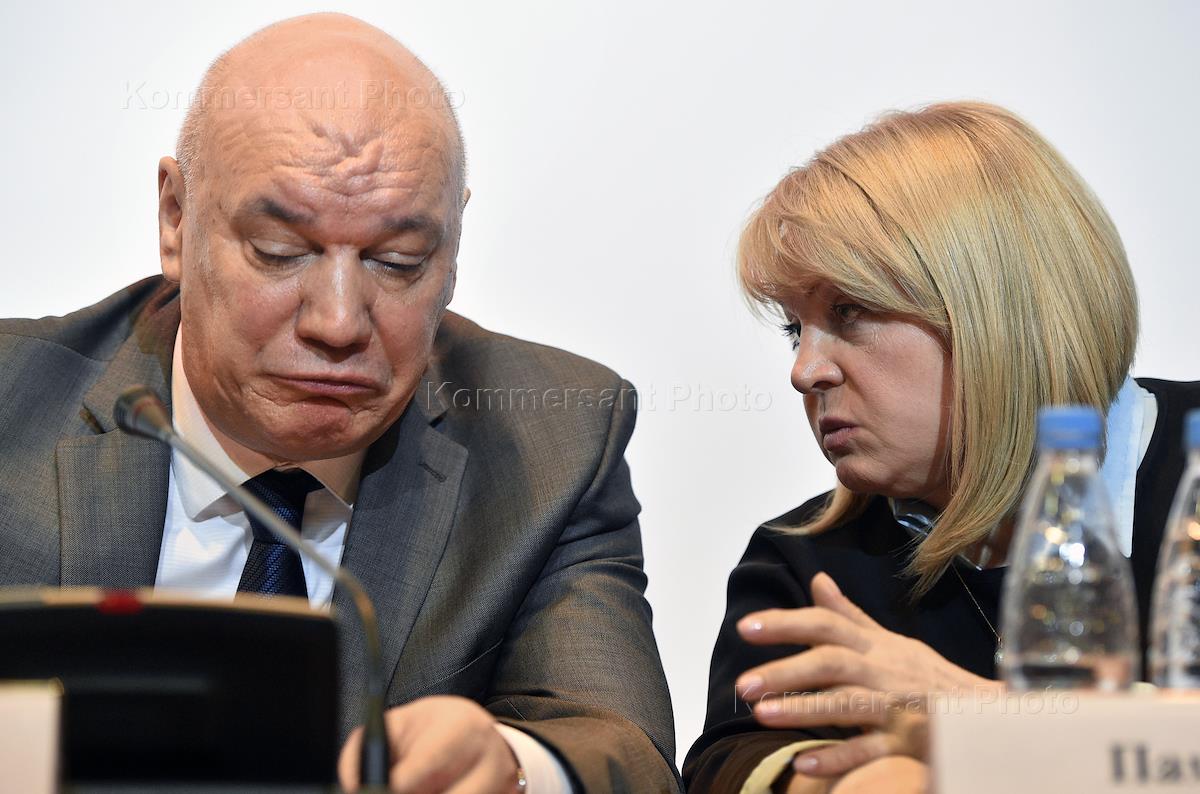 Руководитель Федеральной службы России исполнения наказаний (ФСИН) Геннадий Корниенко (слева) и уполномоченный по правам человека в России Элла Памфилова (справа) во время заседания Координационного совета российских уполномоченных в Доме русского зарубежья имени Александра Солженицына.