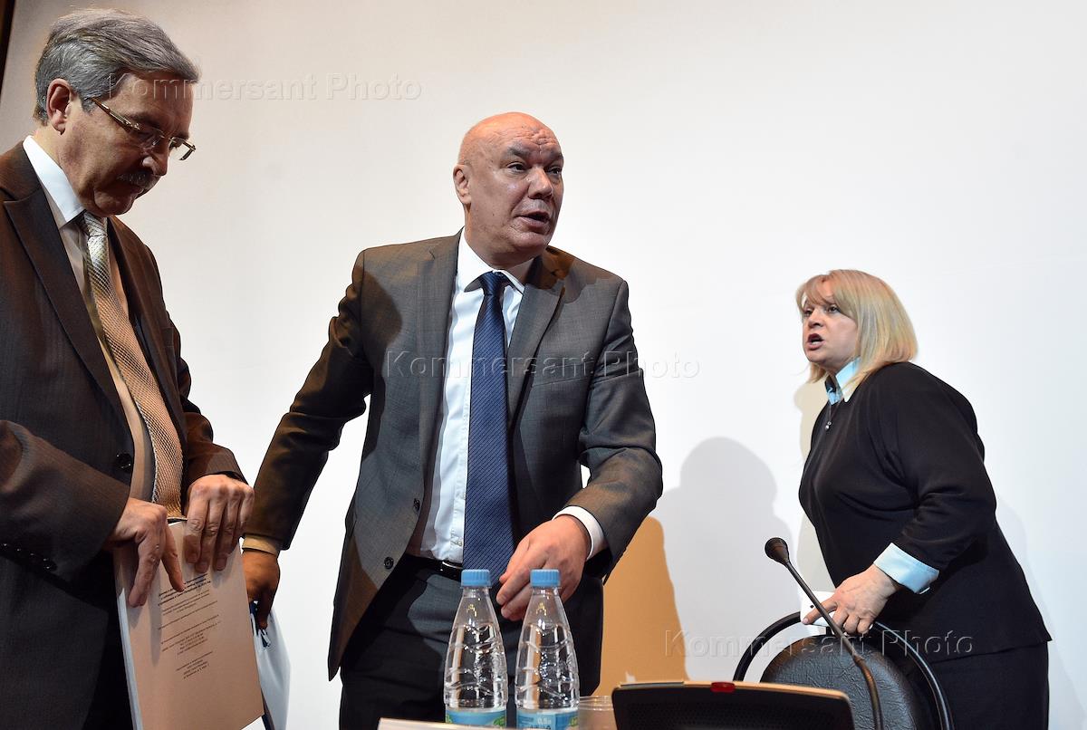 Заседание Координационного совета российских уполномоченных. Слева направо: Заместитель председателя Верховного суда России Владимир Давыдов, уполномоченный по правам человека в России Элла Памфилова и сопредседатель Координационного совета российских уполномоченных по правам человека Александр Шишлов во время заседания в Доме русского зарубежья имени Александра Солженицына.