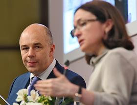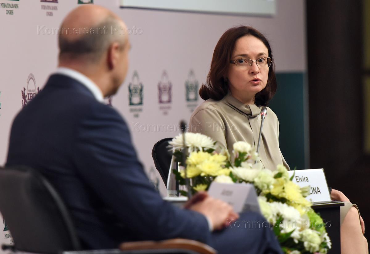 XXIV Международный банковский конгресс. Министр финансов России Антон Силуанов (слева) и председатель Центрального Банка России Эльвира Набиуллина (справа) во время брифинга.