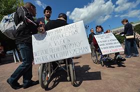 Митинг "За науку и образование" прошел на Суворовской площади. Участники митига в инвалидных колясках с плакатами.