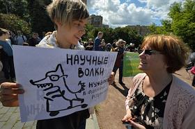Митинг "За науку и образование" прошел на Суворовской площади. Участник митинга с плакатом "Научные волки нуждаются".