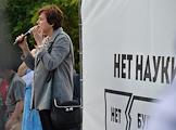 Митинг "За науку и образование" прошел на Суворовской площади. Плакат "Нет науки нет будущего". Главный редактор издательства "Новое литературное обозрение" Ирина Прохорова во время митинга.