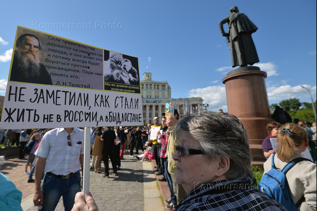 Митинг "За науку и образование" прошел на Суворовской площади. Участник митинга с плакатом "Фальшивых диссертантов вон из науки, фальшивых депутатов вон из Думы".