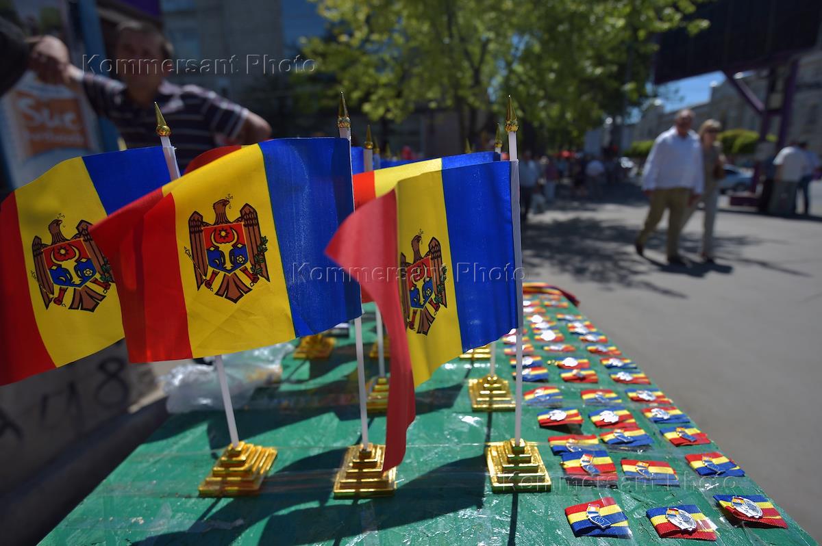 Массовый антиправительственный митинг прошел в Кишиневе. Национальный молдавский флаг сувенирный на столе.
