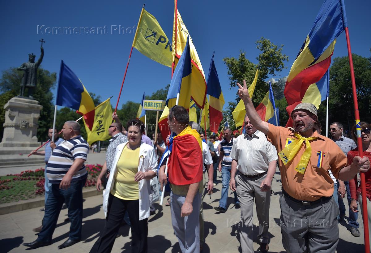 Массовый антиправительственный митинг прошел в Кишиневе. Участники акции с флагами Молдавии.