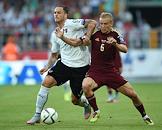 Отборочный матч Чемпионата Европы -2016 по футболу между национальными сброными России и Австрии на стадионе "Открытие Арена". Игрок сборной команды России Юрий Жирков (справа) во время матча.