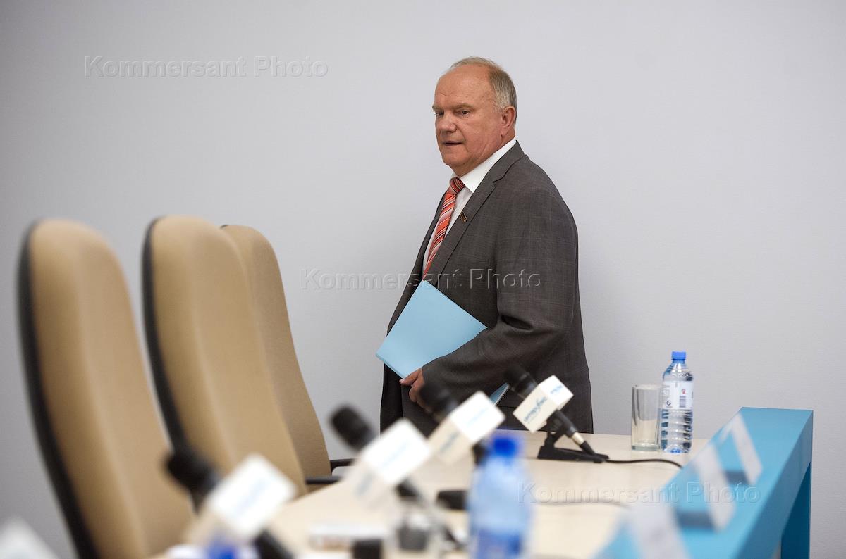 Лидер Коммунистической партии России (КПРФ), член комитета Государственной думы России по науке и наукоемким технологиям Геннадий Зюганов во время пресс-конференции, посвященной инициативе трех думских фракций (исключая КПРФ) о переносе выборов депутатов Государственной Думы с декабря на сентябрь 2016 года. Пресс-конференция прошла в агентстве "Интерфакс".
