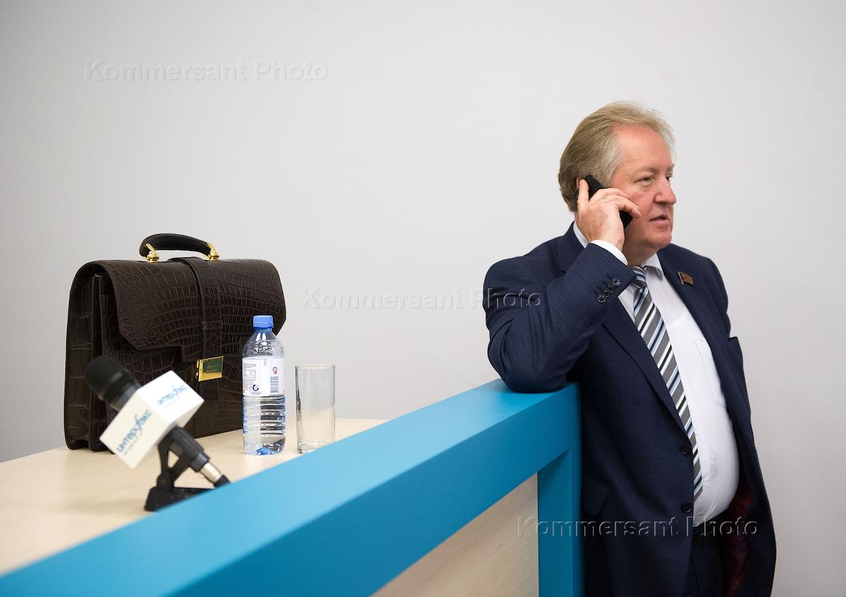 Член Президиума, секретарь ЦК КПРФ, заместитель председателя комитета Государственной думы России по делам общественных объединений и религиозных организаций Сергей Обухов после пресс-конференции, посвященной инициативе трех думских фракций (исключая КПРФ) о переносе выборов депутатов Государственной Думы с декабря на сентябрь 2016 года. Пресс-конференция прошла в агентстве "Интерфакс".
