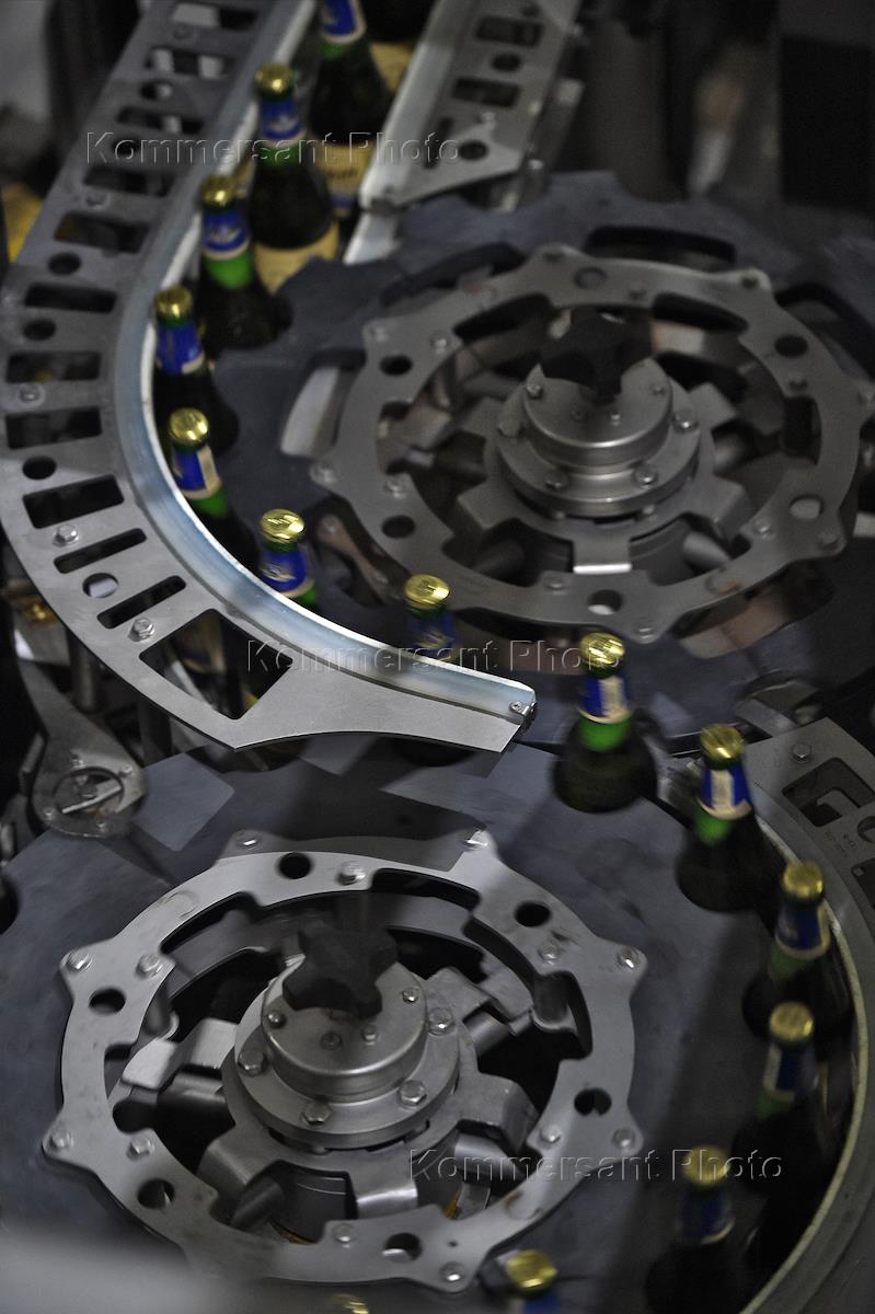 ЗАО "Московская пивоваренная компания". Цех фасовки пива. Стеклянные бутылки с пивом на конвейере.