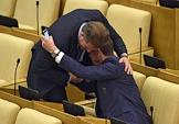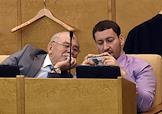 Член комитета Государственной думы (ГД) России по вопросам собственности Антон Жарков (слева) и заместитель председателя комитета ГД России по делам общественных объединений и религиозных организаций Марат Сафин (справа) перед началом пленарного думского заседания.